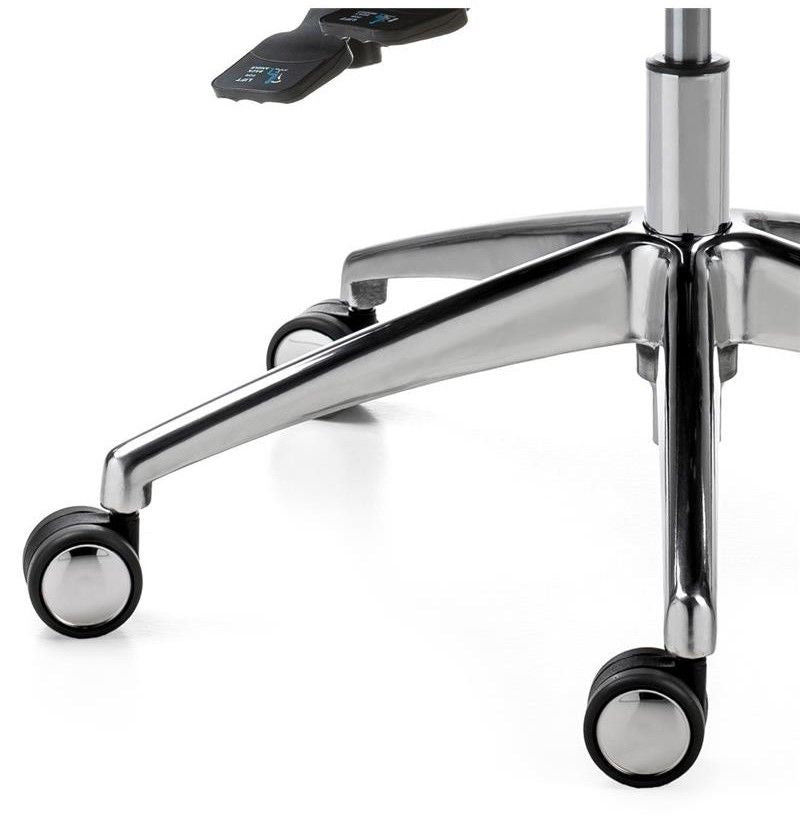 Otra característica relevante son las ruedas con cobertura de goma que hacen que el desplazamiento de la silla sea mucho más suave y sin generar ruidos, además de que evita que tras horas de trabajo se creen rayaduras y desperfectos en el suelo. Como elemento decorativo, incorpora un embellecedor cromado en las mismas, a juego con la base de aluminio pulido.